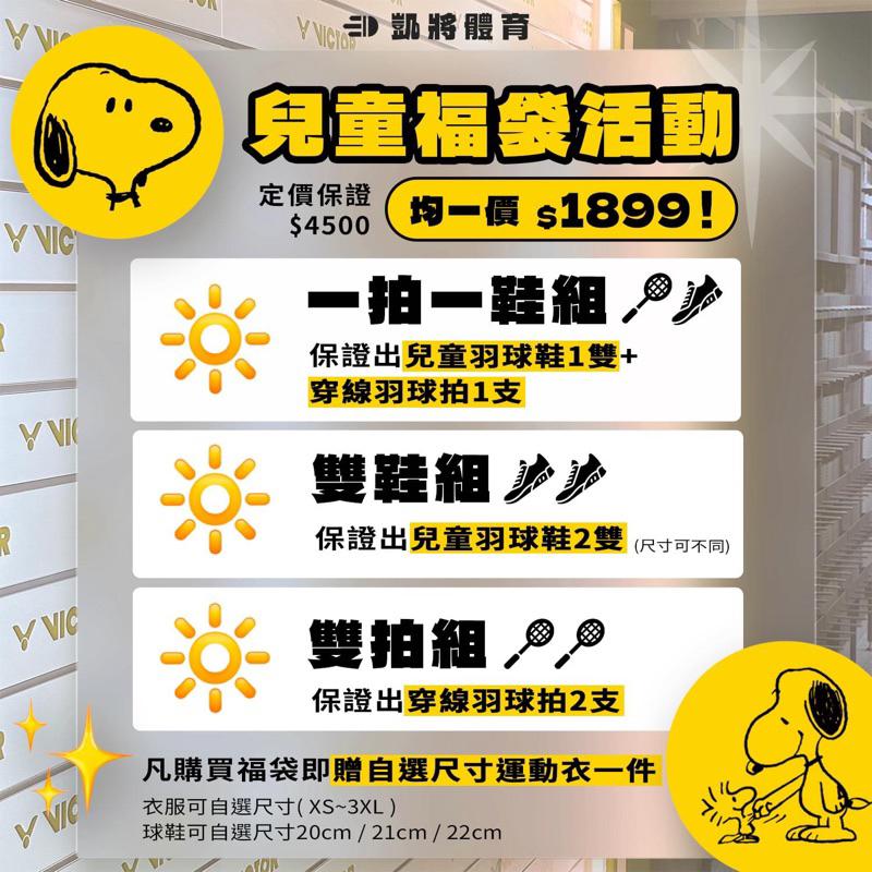兒童福袋活動🌼上線啦!(或小腳的女生也一起享福🤣) #下單備註球鞋尺寸(20/21/22cm)&贈送衣服尺碼( XS~3XL ),感謝 #小孩禮物買了沒😆 小孩打球健康又放電🔋 凱將這次兒童節福袋推出『雙享組合』 不管是1個小孩 / 2個小孩 / 爸媽+小孩 都有得選啦! 【一鞋一拍組】【雙鞋組】 【雙拍組】 雙享禮盒,更好玩,更可愛! 均一價只要$1899!免運到家 一雙童鞋+一隻穿線拍(一拍一鞋組 一雙童鞋+一雙童鞋(雙鞋組 兩支穿線拍(雙拍組 凡購買福袋即贈可指定尺寸運動T一件(兒童節福袋送小孩,爸媽也有禮物) 衣服可自選尺寸( XS~3XL ) 球鞋可自選尺寸20cm / 21cm / 22cm ⭐️下單請備註尺碼鞋碼 🚚福袋皆宅配寄送 ⭐️購買方式:蝦皮下單或私訊轉帳 #私訊搶購☺️ #售完不補喜歡要快💨 注意事項: 1. 福箱內容物價值絕對超過售價,商品皆為全新,品牌皆為一線品牌,不接受任何方式退換貨。 2. 福袋內文有提及的商品都會保證內含,款式皆為隨機款式,隨機小禮物數量與款式都不固定,請評估了解福袋的規則後再購買。 3. 即日起皆可下單,將於當日或隔日出貨,週末日貨運無運送,急的客人還請見諒。 4.福袋每款皆限量販售,售完為止。 5.凱將體育保留活動最終解釋之權力。