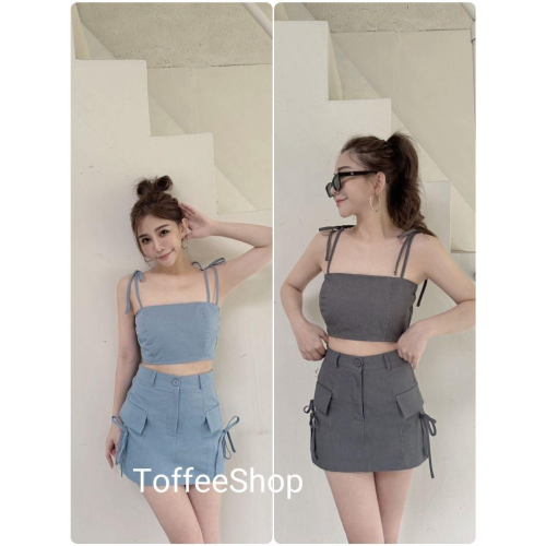 ❤️現貨藍/灰❤️7206細肩帶背心綁帶背心上衣+工裝短裙褲裙兩件式套裝