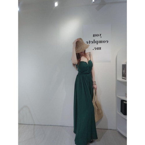 ❤️現貨綠❤️8877細肩帶美胸長洋裝綁帶長洋美背長洋裝傘擺長洋渡假長洋裝