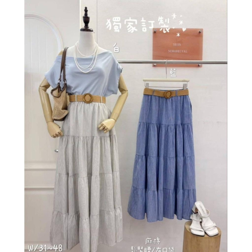 ❤️現貨白/藍❤️07002獨家訂製百搭氣質條紋長裙附皮帶蛋糕裙