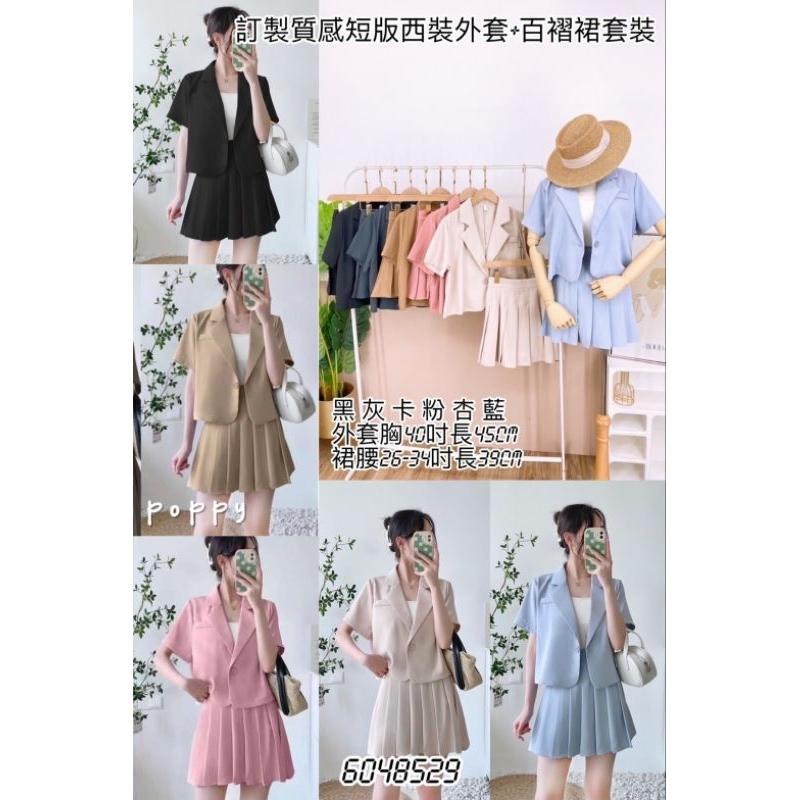 💗現貨藍/杏💗60485質感短版西裝外套+鬆緊腰圍百褶裙褲裙兩件式套裝學院風套裝