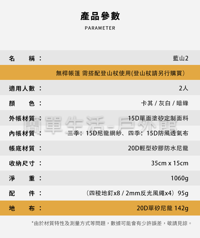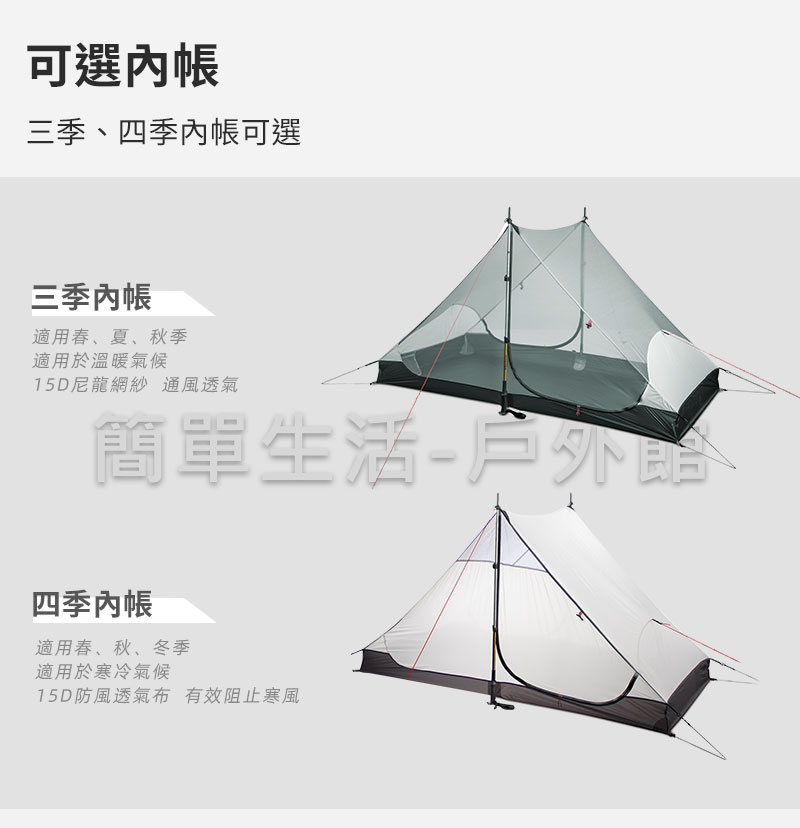 【簡單生活】台灣現貨 三峰出 藍山2 雙人 無杆帳 非自立帳 無桿帳 15D 三季 四季 帳篷