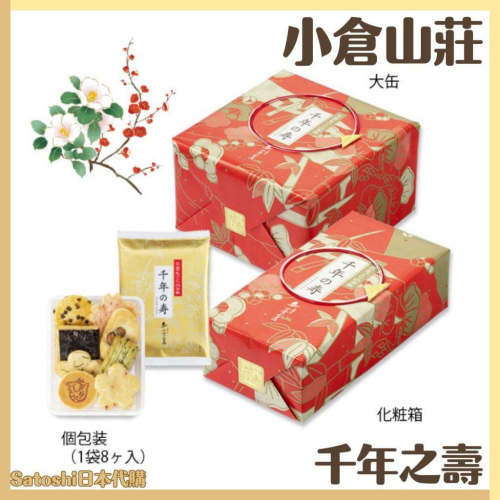 【2026新年禮盒預購】小倉山莊 仙貝 日本仙貝 千年之壽 吉祥 新年 鐵盒 春節禮盒 綜合仙貝禮盒 過年禮盒 新春禮盒 👍歡迎公司行號.自用大量採購 可聊聊詳談👍 目前新年送禮接單中~💕💕 因應今年過年較晚 12月底過後下單商品皆為3月中旬以後的賞味期限 有不清楚的地方都歡迎私訊聊聊😋😋 商品皆有提袋 持續接單到約2026 1/10左右 有現貨會直接放在選項上提供選購 農曆年前皆可收到商品 保證有商品👍👍👍👍 千年之壽 🎁化妝箱9袋(紙盒) ✅内容量:8入8袋=72枚仙貝 ✅尺寸:26.3 x 14.3 x 7 cm 🎁小禮盒(鐵盒) ✅内容量:8入12袋=104枚仙貝 ✅尺寸:24.2 x 24.2 x 7.4 cm 🎁中禮盒(鐵盒) ✅内容量:8入16袋=144枚仙貝 ✅尺寸:24.2 x 24.2 x 9.3 cm 🎁大禮盒(鐵盒) ✅内容量:8入24袋=216枚仙貝 ✅尺寸:24.2 x 24.2 x 12.8 cm 吉祥一陽來復 🎁大禮盒(鐵盒) ✅内容量:13種仙貝25袋 ✅尺寸:29 x 25 x 9 cm 🎁特大禮盒(鐵盒) ✅内容量:13種仙貝39袋 ✅尺寸:29 x 25 x12.5 cm 附紙袋 如需多拿紙袋下單前可以備註 給大家最甜的價格~