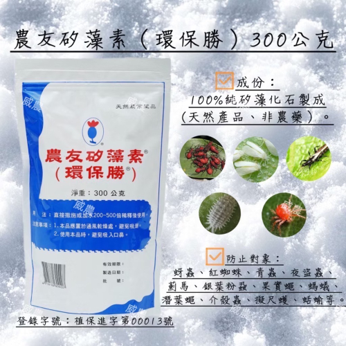農委會動植物防疫檢疫局登錄字號:植保進字第00013號包裝規格:300公克/包成分:100%純矽藻化石製成(天然產品、非農藥)。