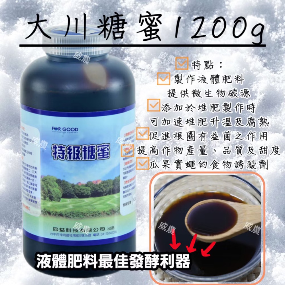 特級糖蜜、含多種微量元素適合各種農作物,提供微生物碳能源,加速提高堆肥溫度及腐熟度,可製作液體肥料促進根圈有益菌之作用,提高作物產量、品質及甜度。