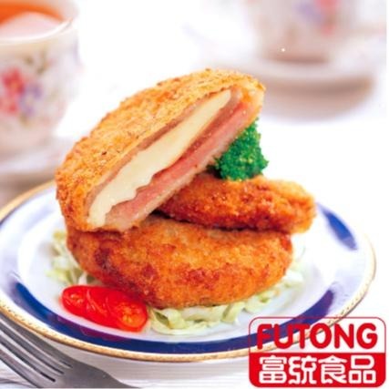 豬肉〔台灣、丹麥(不含萊克多巴胺)〕、麵粉、麵包粉﹝麵粉(小麥、L-抗壞血酸)、水、精製棕櫚油(棕櫚油、香料、混合濃縮生育醇(抗氧化劑))、鹽、黃豆粉、酵母、玉米澱粉、硫酸鈣、碳酸氫銨製劑(碳酸氫銨、碳酸鎂)、L-抗壞血酸(抗氧化劑)、酵母抽出物、精製 椰子油﹞、水、起司、火腿(台灣)、蛋白粉、沙拉油、鹽、L-麩酸鈉、黏稠劑(鹿角菜膠、玉米糖膠、糖)、品質改良劑(多磷酸鈉、焦磷酸鈉、焦磷酸鉀)、胡椒、抗氧化劑(異抗壞血酸鈉)