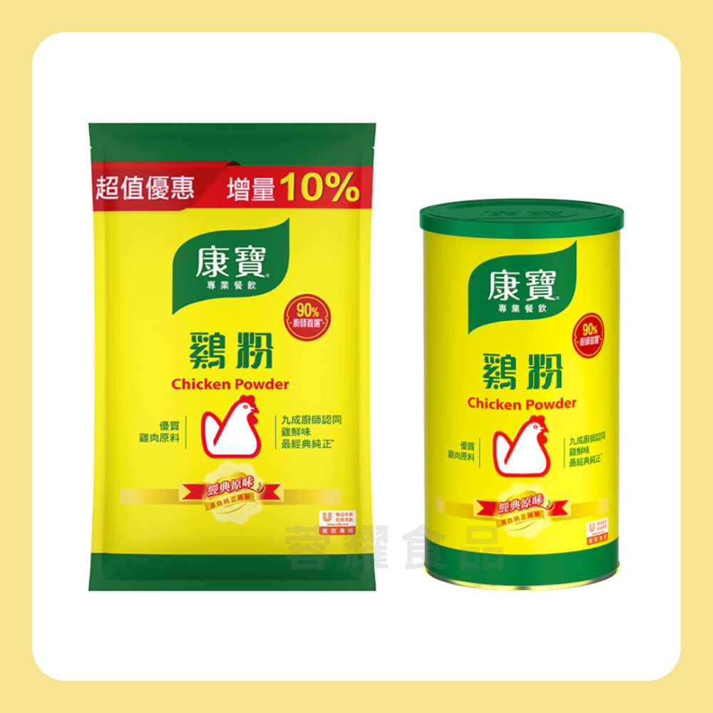 近九成廚師認同康寶雞粉的鮮雞味最經典,幫助做出經典味道的菜餚* 經典原味,雞鮮純正,使菜式口味均衡鮮香,不會過鹹搶味,廣泛適用於各式調味,提升食材及菜餚鮮味,味道更加出眾,不添加防腐劑、人工色素。康寶雞粉精選上等嫩雞,始終如一的保持其經典的純正雞鮮味,運用先進的造粒生產技術,使得康寶雞粉能更與各類原料融合,達到自然提鮮的效果,帶出食材鮮香味。選自美國的優質雞肉,所用的雞肉均經過高溫處理,無添加防腐劑及人工色素,保留純正雞肉風味。