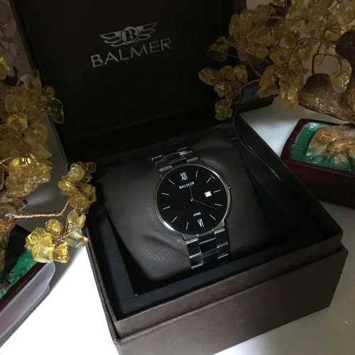 BALMER WATCH 寶馬 時尚銀殼外框黑面不銹鋼殼三鈑鋼帶日期兩針石英男腕錶 型號:7939