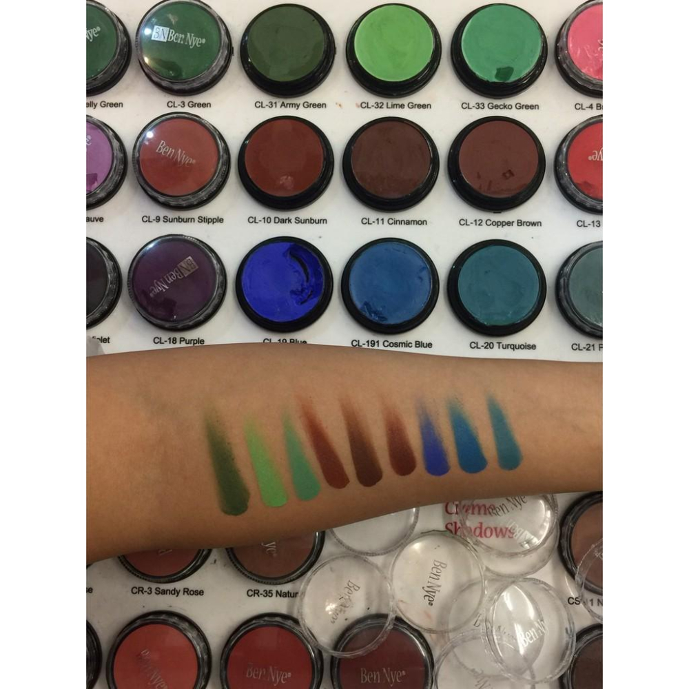 人體彩繪油彩 Ben Nye美國原裝Creme Colors 7g 3/4 影片中依序上色的色號是 : CL-31 Army Green 迷彩綠 CL-32 Lime Green 萊姆綠 CL-33 Gecko Green 壁虎綠 CL-10 Dark Sunburn 曬傷 CL-11 Cinnamon 桂皮色 CL-12 Copper Brown 銅褐色 CL-19 Blue 藍色 CL-191 Cosmic Blue 阿凡達藍 CL-20 Turquoise 藍綠色 1. 當室內外活動像 Cosplay 角色扮演外拍、小丑、八家將、官將首... 2. 室內表演: 京劇、國劇、或 公司產品參展 ... 需要大量流汗,卻又不方便補妝, 3. 美國 BenNye 臉部及身體彩繪油彩 + 超微粒透明定妝粉 就派上用場。 4. 可以只選單色,或是買多色和其他顏色互調。 5. 保證不脫妝,不龜裂,防流汗,不用補妝。 使用小技巧: 1. 可用一般圓形永和三美人海綿,或用牙刷形粉底刷(推!用量省又沒有海綿的刷痕) 2. 或用遮瑕刷、唇彩刷...等可沾膏狀商品的刷具畫出線條或圖案, 3. 也可直接用手指,不沾水 ( 因為它不是水彩,油水不相容 ) 4. 將油彩用上述的 1-3 手法塗抹於素臉或身體皮膚上, 5. 畫出您想要的動物圖案、小丑角色、漫畫書中的幻想人物。 6. 再輕灑些許 BenNye 的超微粒透明定妝粉, 7. 用平常餘粉刷,輕輕刷開,** 請保持 少量多層的原則, 因為過多的定妝粉還是要刷掉,太浪費了,雖然會很高興妳很快會再來買 ! 小叮嚀: BenNye 的所有產品包括油彩,都是專門設計給臉部皮膚及身體所使用, 不同於其他用了會過敏的工業油彩、廣告原料,所以請安心使用 !! 卸除方式: 先用 深層快速卸妝油 Quick Cleanse(或自己手邊有的卸妝商品),再洗面乳洗臉即可 特別適合: 迎新晚會、萬聖節 (Halloween Party)、聖誕舞會 (X-mas Party)、 化妝舞會 (Dance Party)、學生電影、畢業舞會 (Graduation Party)、 公司參展 Logo 宣傳 (Exhibition, Fair)、公司新產品發表會、Cosplay 角色扮演。 #彩繪 #傷妝 #舞台妝 #萬聖節妝扮 #cosplay #小丑