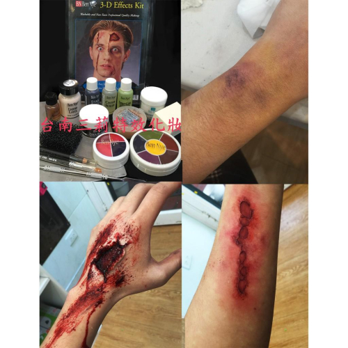 受傷妝免學費實作課程-台南三莉特效化妝 1. 免學費課程持續開課中,只需購買一組材料包即可參加為時兩小時的基礎受傷妝示範+實作課程,教學內容有瘀傷、破皮、砍傷、擦傷、血管。 2. 上課時間約2-2.5小時,免學費,材料包一組原價 $3790, 特價 $3500,上完課可帶走,內容物為以下: 四色燒燙傷油彩 $620、液態乳膠 $310、假血漿 $190、延展調和油 $180、可塑型皮膚蠟 $260、黃膠 $190、橘子香卸膠水 $180、鬍渣及傷妝刷棉 $50、細節刷$80、超微粒透明定妝粉 $270、六色傷妝油彩 $840、凍狀血漿 $320、多功能筆刷$120、不鏽鋼雙頭挖棒$180。 4. 因台南門市場地小而美,為維持舒適上課品質,每班最多只收5人,另為平衡師資費用未滿2人則不開課。 5. 材料包 $3500 需於上課一星期前先繳清,材料包可上課當天領取,或郵寄(運費$60)。 6. 上課工作室地點:台南市北區賢北街225巷49弄3號。 7. 報名電話:0910-590-494。 8. 臉書粉絲專頁:台南三莉 特效化妝,有任何優惠活動都會及時發佈。 9. 上課需要的海棉現場會提供,自己有的傷妝相關材料也歡迎帶來玩。