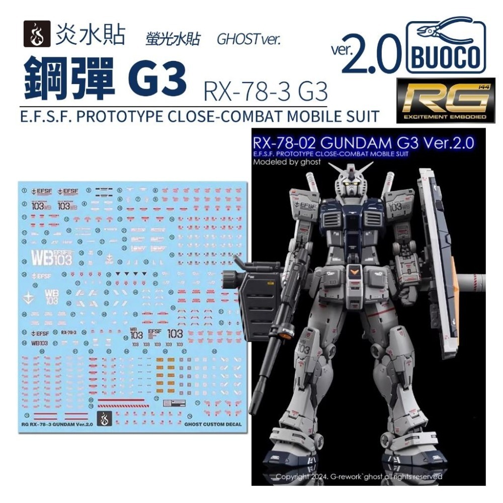BUOCO、炎水貼、GHOST、RG、G3、RX783、鋼彈G3、螢光水貼、Ver2.0、水貼、模型