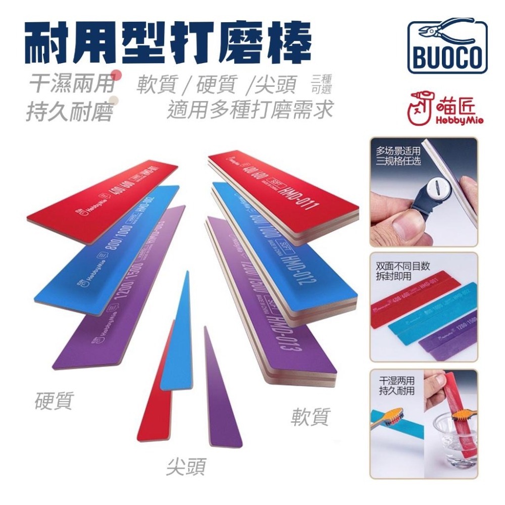 BUOCO、喵匠、HOBBYMIO、打磨棒、打磨條、硬質、軟質、尖頭、曲面、C面、平面、鋼彈模型、模型打磨、打磨耗材、模型工具、細節修整、水洗打磨棒、模型改造