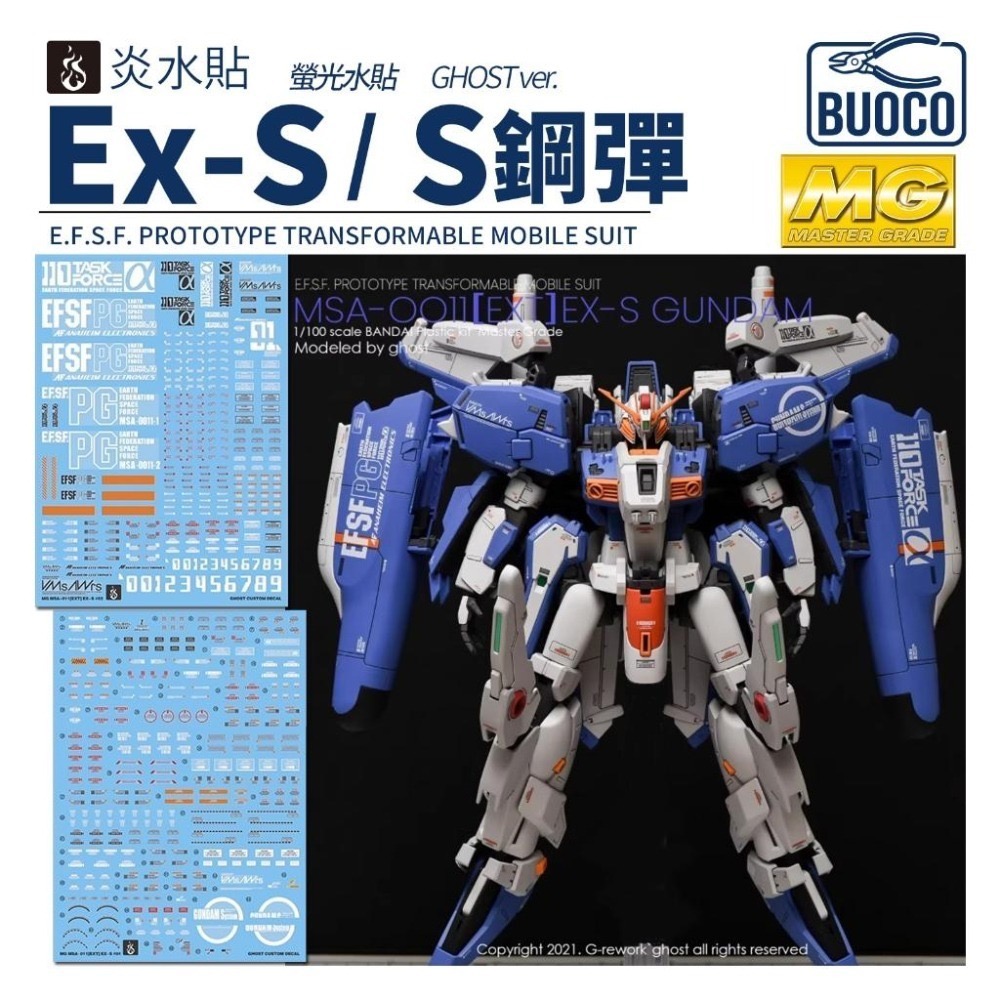 BUOCO、炎水貼、GHOST版、MG、1/100、EX-S鋼彈、S Gundam、EXS、鋼彈前哨戰、Sentinel、AE、螢光水貼、鋼彈模型、水貼、組裝模型