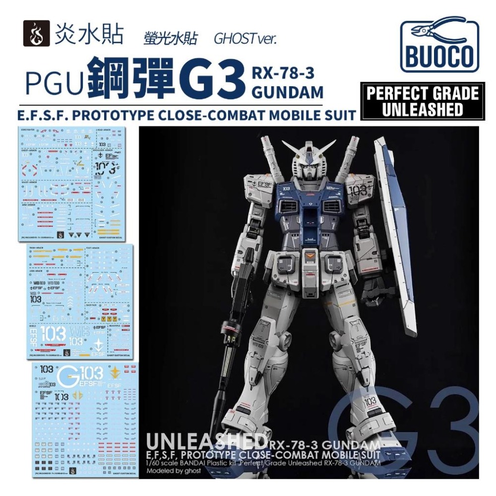BUOCO、炎水貼、GHOST、PGU、RX-78-3、G3鋼彈、螢光水貼、PGUNLEASHED、1/60、模型、水貼