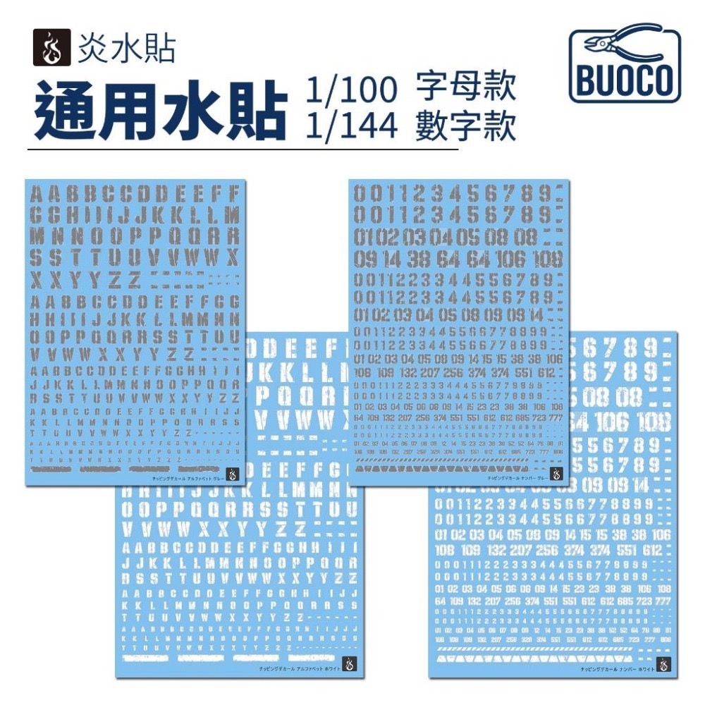 BUOCO、炎水貼、舊化水貼、掉漆字體、字母水貼、數字水貼、軍武風、水貼、模型貼紙、1/144、1/100 、斑駁