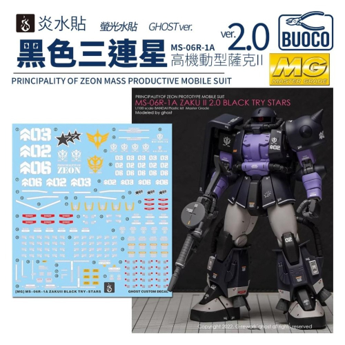 BUOCO、炎水貼、GHOST版、MG、1/100、MS-06R-1A、黑色三連星、薩克II、高機動型、R1A、ZEON、螢光水貼、鋼彈模型、水貼、組裝模型