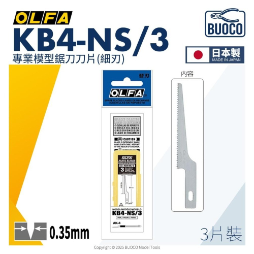 OLFA KB4-NS/3 為日本製專業模型鋸片刀片,採用高碳鋼材質與細齒鋸設計。