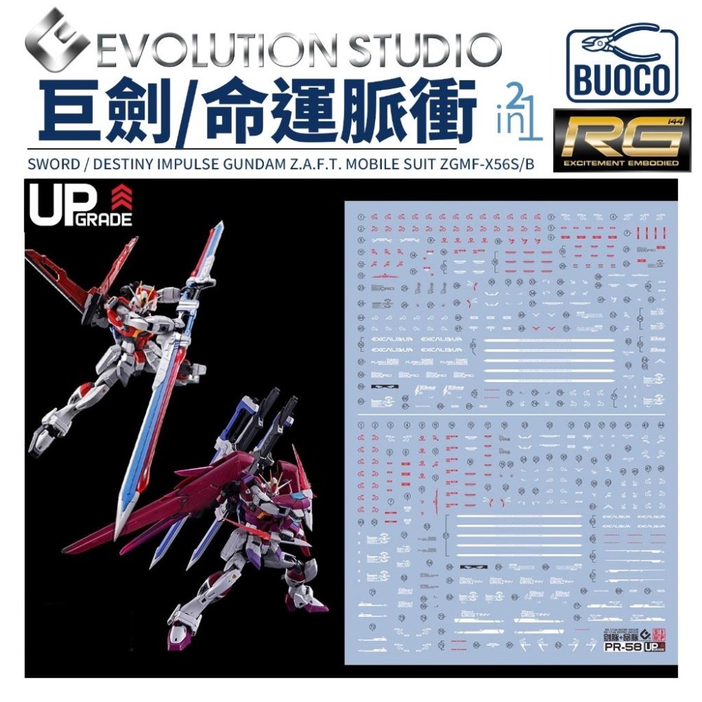 BUOCO, EVO, 水貼, 鋼彈, 模型, 螢光水貼, RG, 脈衝鋼彈, ImpulseGundam, 巨劍型, SwordImpulse, 命運脈衝, DestinyImpulse, 真飛鳥, ShinnAsuka, 斬艦刀, 王者之劍, Excalibur, 1/144