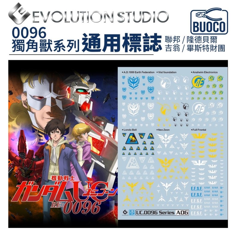 BUOCO, EVO, 水貼, 鋼彈, 模型, 螢光水貼, 0096, 獨角獸, 報喪女妖, 新安州, 剎帝利, 隆德貝爾, 畢斯特, 帶袖的, UC, Gunpla