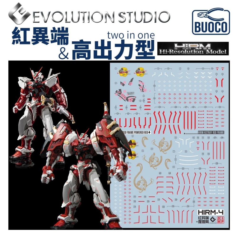 這款由 EVO 出品的 **HIRM-4 專用套裝水貼**,一張就能滿足 **標準型 (Red Frame)** 與 **高出力型 (Powered Red / 猩猩臂)** 兩種型態的需求。