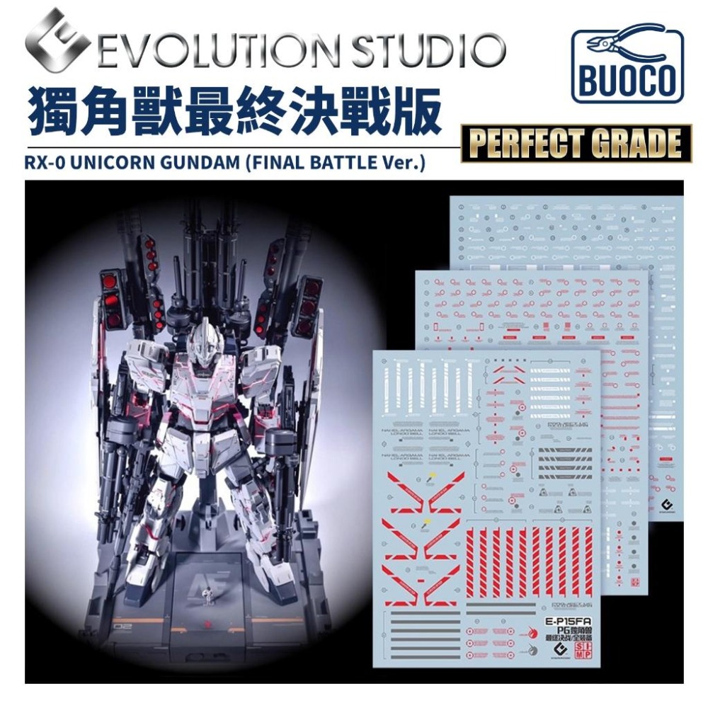 BUOCO, EVO, 水貼, 鋼彈, 模型, 螢光水貼, PG, 獨角獸, Unicorn, 全裝甲獨角獸, FullArmor, 紅色框架, 毀滅模式, 擬阿卡馬, 燃料槽, 1/60, 巴納吉