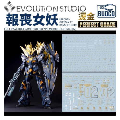 BUOCO, EVO, 水貼, 鋼彈, 模型, 燙金水貼, PG, 報喪女妖, Banshee, Norn, 諾恩, 命運女神, 利迪, 瑪莉妲, 獨角獸二號機, 1/60, 黑獅子