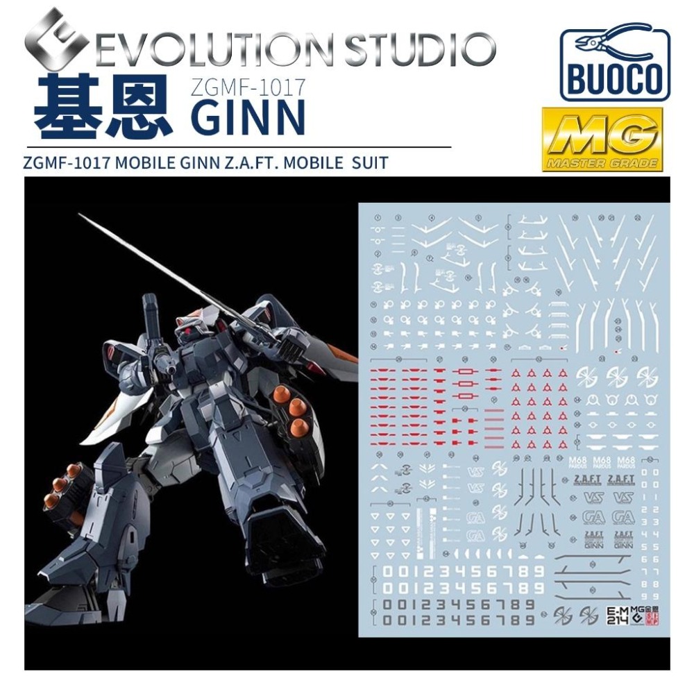 [BUOCO] EVO MG-214 機動戰士鋼彈 SEED MG 基恩/金恩 (GINN) 螢光水貼 (1/100) - 札夫特 / 實體劍 / 飛彈艙 / 威薩留斯號 / 專用標誌 / ZGMF-1017