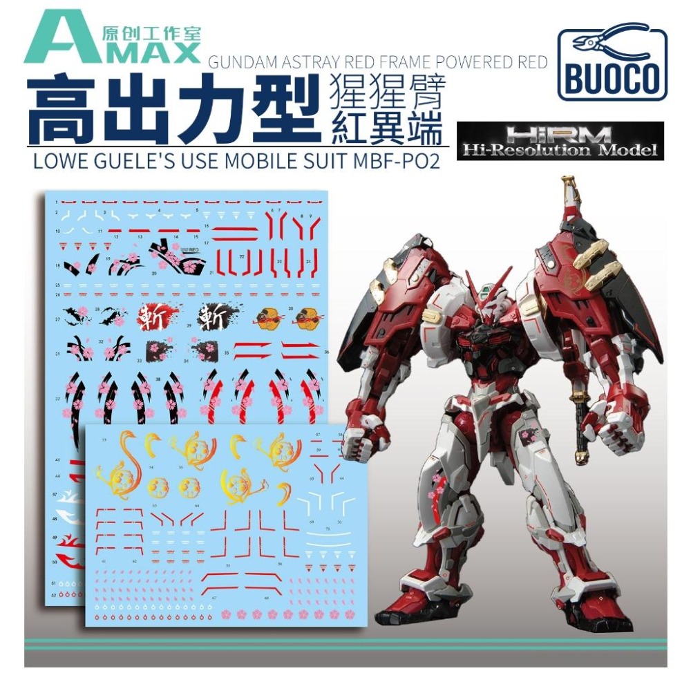 BUOCO, AMAX, 異端鋼彈, 紅異端, AstrayRedFrame, PoweredRed, HiRM, 猩猩臂, 高出力型, 羅裘爾, 菊一文字, 櫻花, 斬, 螢光水貼, 鋼彈, 模型, 水貼