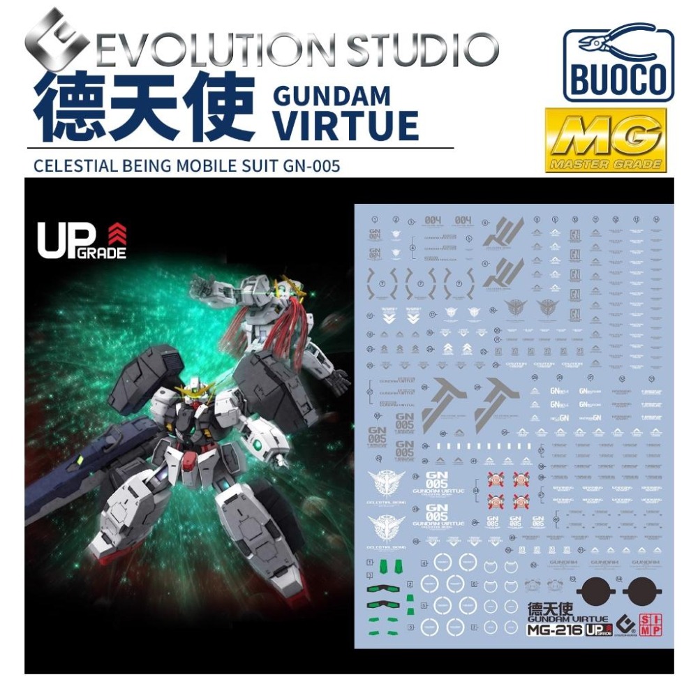 BUOCO, EVO, 水貼, 鋼彈, 模型, 螢光水貼, MG, Gundam00, Virtue, Nadleeh, TieriaErde, CelestialBeing, 德天使, 娜德雷, 娜德雷鋼彈, 中性鋼彈, 提耶利亞, 天人, 爆甲, 審判系統, GN火箭砲, 萬死