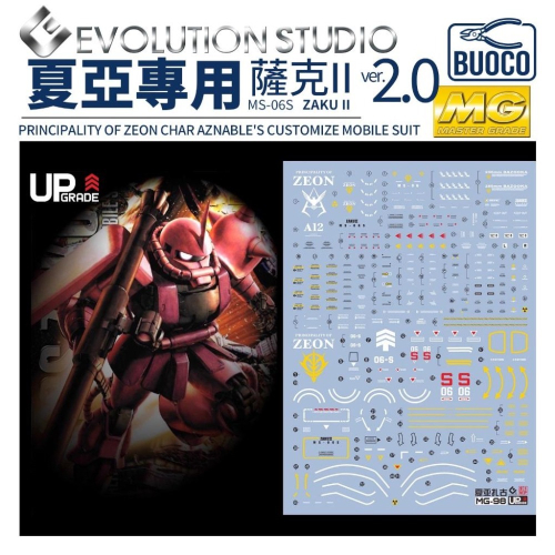 BUOCO, EVO, 水貼, 鋼彈, 模型, 螢光水貼, MG, OneYearWar, CharsZakuII, MS06S, CharAznable, Zeon, RedComet, A12, ZakuBazooka, 夏亞專用, 薩克II, 紅薩克, 紅色彗星, 三倍速, 吉翁
