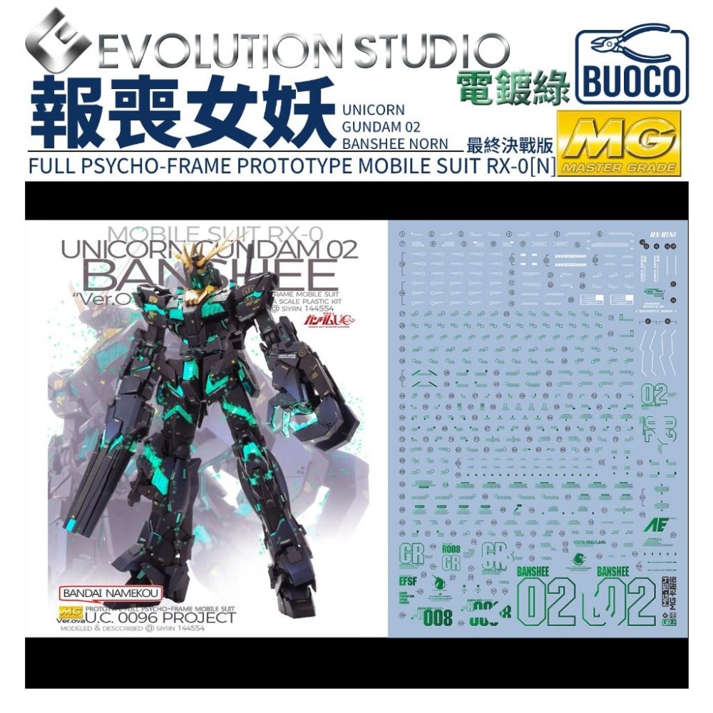 BUOCO, EVO, 水貼, 鋼彈, 模型, 燙金水貼, MG, GundamUC, BansheeNorn, FinalBattle, Awakened, RiddheMarcenas, MetallicGreen, RX0N, 報喪女妖, 命運女神, 最終決戰, 覺醒版, 電鍍綠, 綠骨架