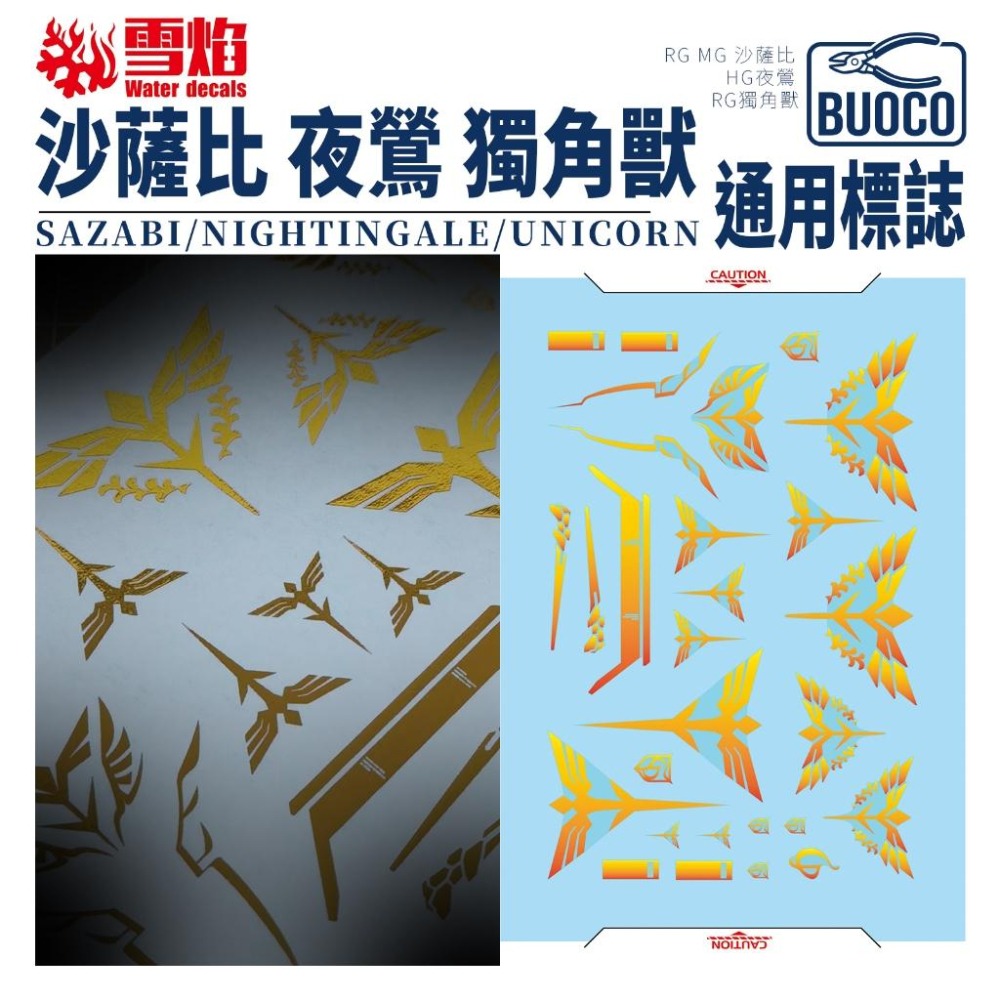 BUOCO, 雪焰, Sazabi, 沙薩比, Nightingale, 夜鶯, Unicorn, 獨角獸, NeoZeon, 新吉翁, CharAznable, 夏亞, GoldDecal, 燙金水貼, 通用標誌, 螢光水貼, 鋼彈, 模型