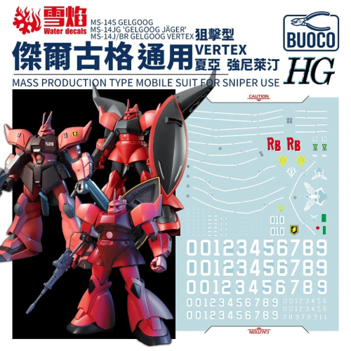 BUOCO, 雪焰, Gelgoog, 傑爾古格, VERTEX, J型, 狙擊型, MS14, Zeon, 吉翁, CharAznable, 夏亞, ChimeraCorps, 奇美拉隊, JohnnyRidden, 強尼.萊登, 強尼.萊汀, 通用型, HG, 螢光水貼, 模型