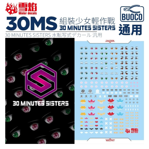 - 30MS 系統標誌:包含 "30 MINUTES SISTERS" 標題 Logo 與 "S" 字型六角標誌,適合貼在底座或裝甲顯眼處。