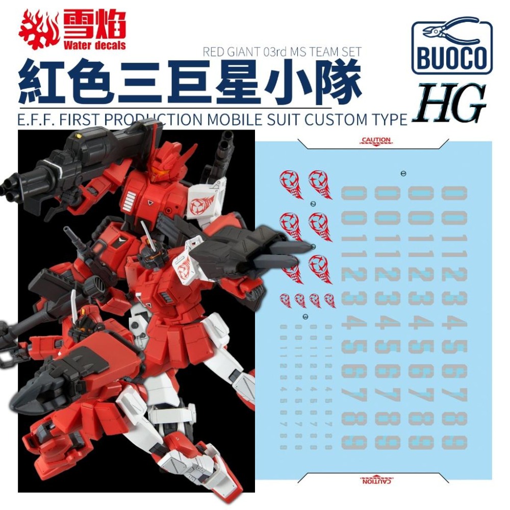 本款水貼專為 PB限定 HG 1/144 Red Giant 03rd MS Team Set (紅色三巨星小隊套裝) 設計,一張水貼即可滿足三台機體的需求: