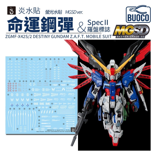 為了讓這台極具張力的 Q 版神機,不僅擁有精緻的裝甲刻線,更能完美升級為劇場版最新的機體設定,BUOCO 引進 **炎水貼** 專為 MGSD 命運鋼彈開發的 **Spec II & 羅盤樣式** 專用款水貼。
