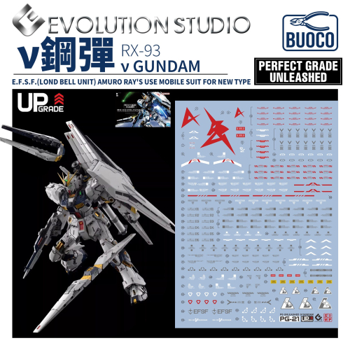 本款水貼專為 PGU 1/60 比例 RX-93 v Gundam 設計,包含以下極具 EVO UPGRADE 風格的專屬細節: