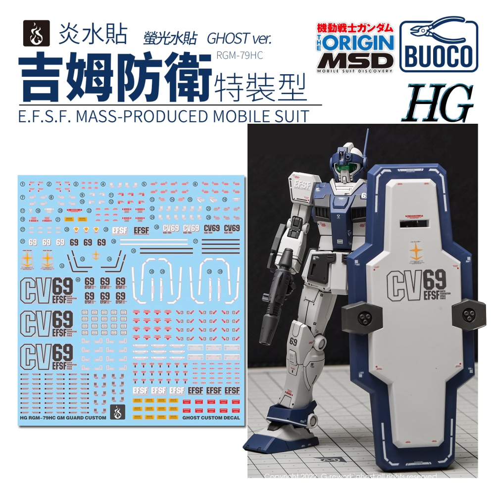 BUOCO, 炎水貼, GMGuardCustom, 吉姆防衛特裝型, 吉姆, RGM79HC, THEORIGIN, MSD, EFSF, 地球聯邦軍, 守護者盾牌, GHOST, 螢光水貼, HG, 水貼, 模型