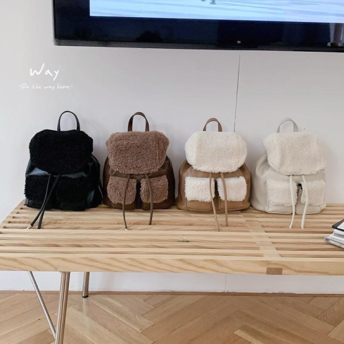 𝐖𝐚𝐘♡·現貨棕|可愛必備౨ৎ 韓款超Q毛毛撞色拼接皮革後背包 實用雙肩包 束口包 手提包✨