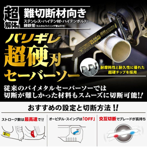 特點: 採用硬質合金刀頭,具有優異的耐磨性和抗崩刃性。 即使是使用傳統雙金屬節省鋸子難以切割的材料,它也可以順利切割並用於廣泛的用途。 它在拆除建築和結構物以及拆卸車輛和船舶等各個領域都發揮著威力。 。 [用途] 適用於不銹鋼、高強度木材、高強度螺栓、鑄鐵管等難切割材料