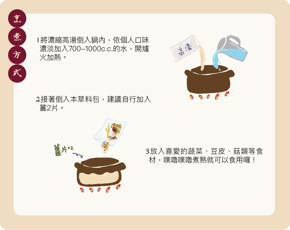 ✔建議可搭配2-3片薑片,提升高湯的濃醇口感。