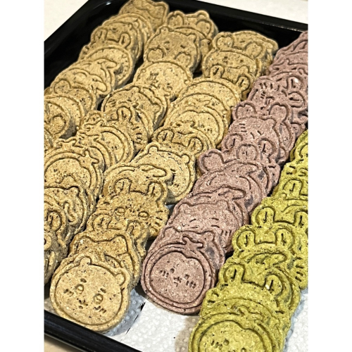 磨牙餅基本原料:小分子綜合穀粉、亞麻籽粉、小麥胚芽粉、菠菜粉、胡蘿蔔粉、紫薯粉、南瓜粉