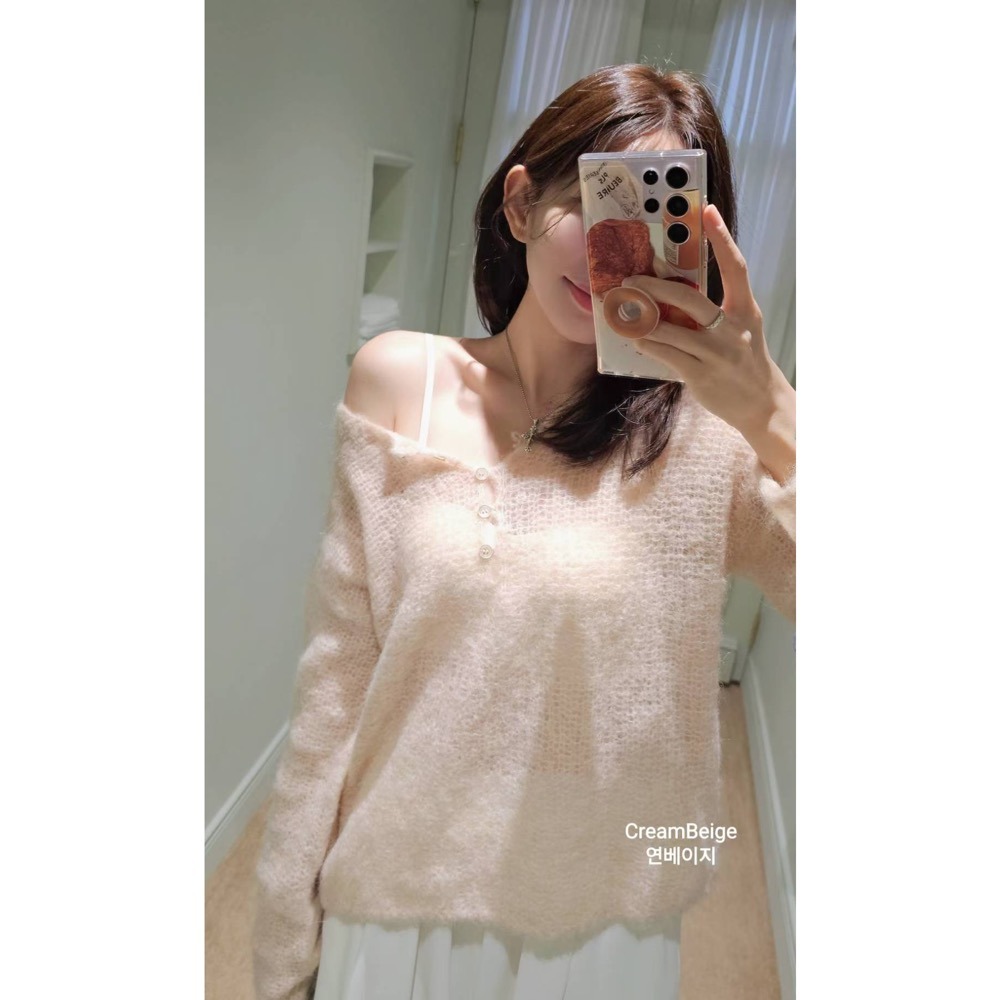 半開襟亨利領設計,單穿或是疊搭都很適合的一款毛衣,透肌的空氣感好美。