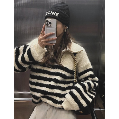 • 設計亮點: 經典不敗的黑白條紋,搭配最流行的半拉鍊設計。拉鍊拉起來是保暖高領,拉下來是大翻領,視覺上超級顯臉小!