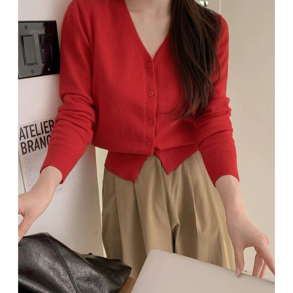 這款針織外套的紅調得非常正,是那種一眼驚艷、誰穿誰顯白的命定色。