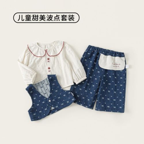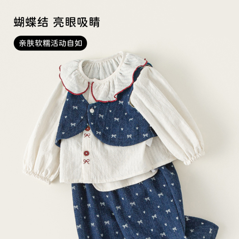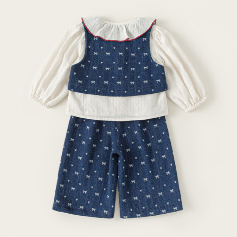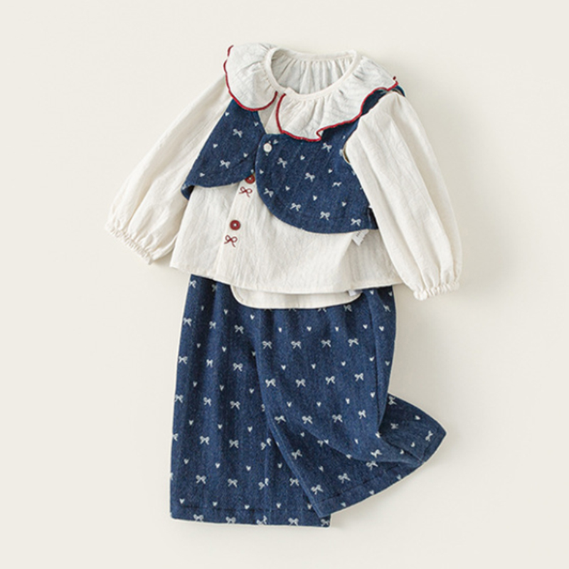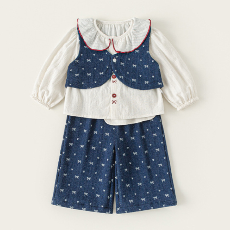 這款 韓版春裝女童蝴蝶結闊腿褲三件套,精心搭配娃娃衫、牛仔馬甲與蝴蝶結闊腿褲,層次豐富又不繁雜,輕鬆打造女寶寶的春日時尚造型。