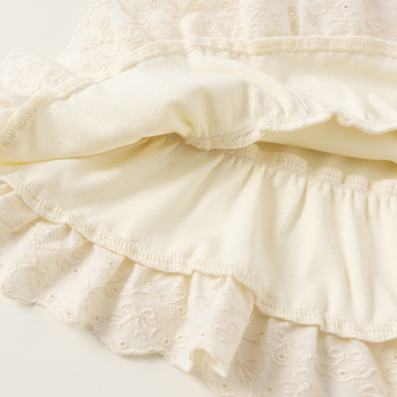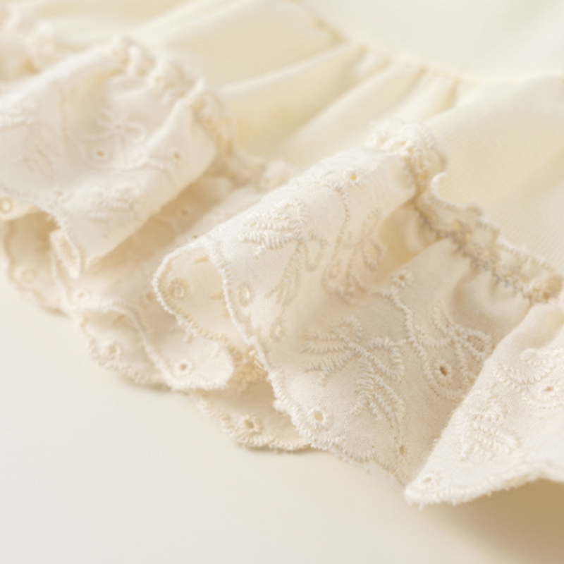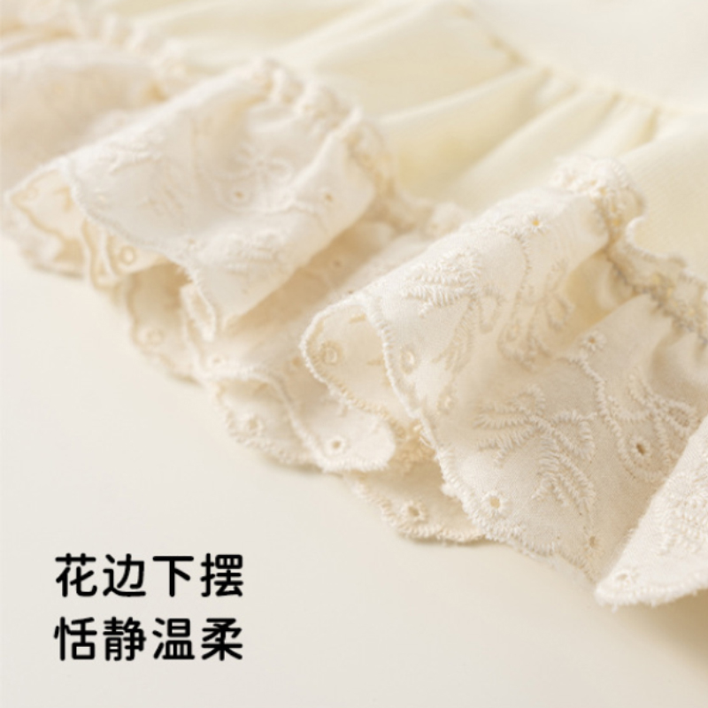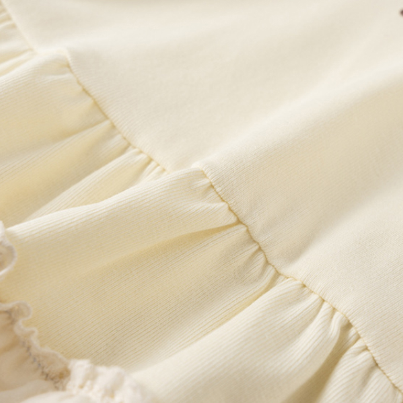 面料採用 89%聚酯纖維+11%彈性纖維,布料滑順柔軟、彈性佳,活動時不緊繃;花邊部分為 100%棉,貼膚位置舒適不刺癢。透氣不悶,適合春季與換季穿著。