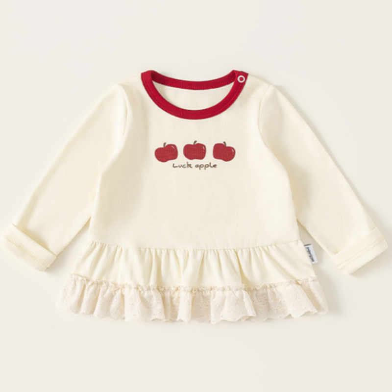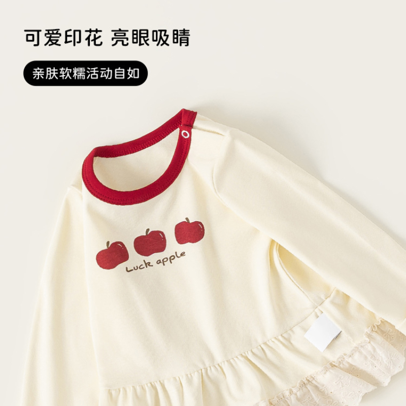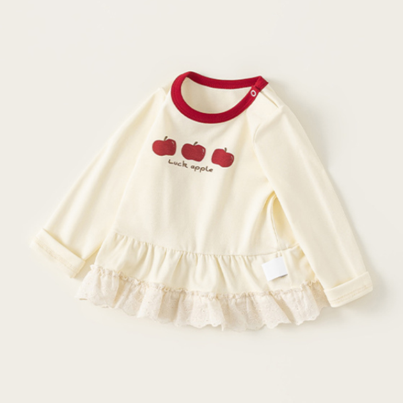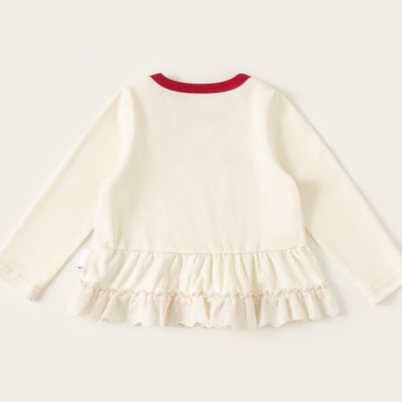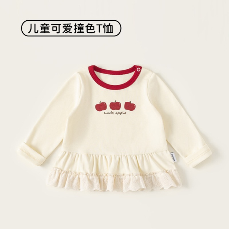這款 童裝春季新款女寶寶花邊撞色圓領長袖T恤,以甜美花邊結合撞色設計,讓基本款上衣多了層次感,單穿可愛、內搭更有造型感。