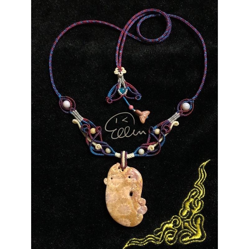 暖黃色系大花珊瑚玉瑞獸雕刻牌件 貔貅與斧頭造型的結合,呈現平安與福的好寓意