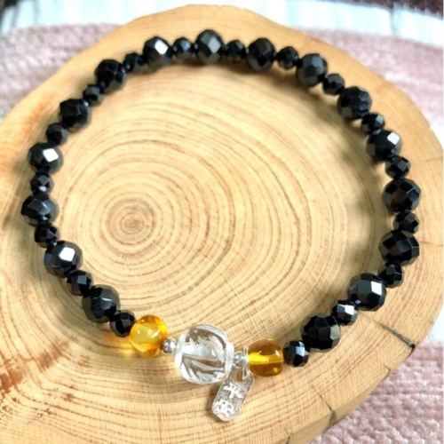 襯托手刻六字白水晶以及小小隨形方琥珀